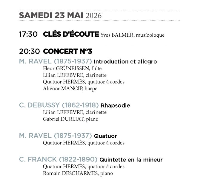 La présence du chant et de la harpe sera une nouveauté importante dans cette programmation. Celle-ci sera mise en valeur par le musicologue Yves Balmer, au cour des clés d’écoute et des présentations des concerts.